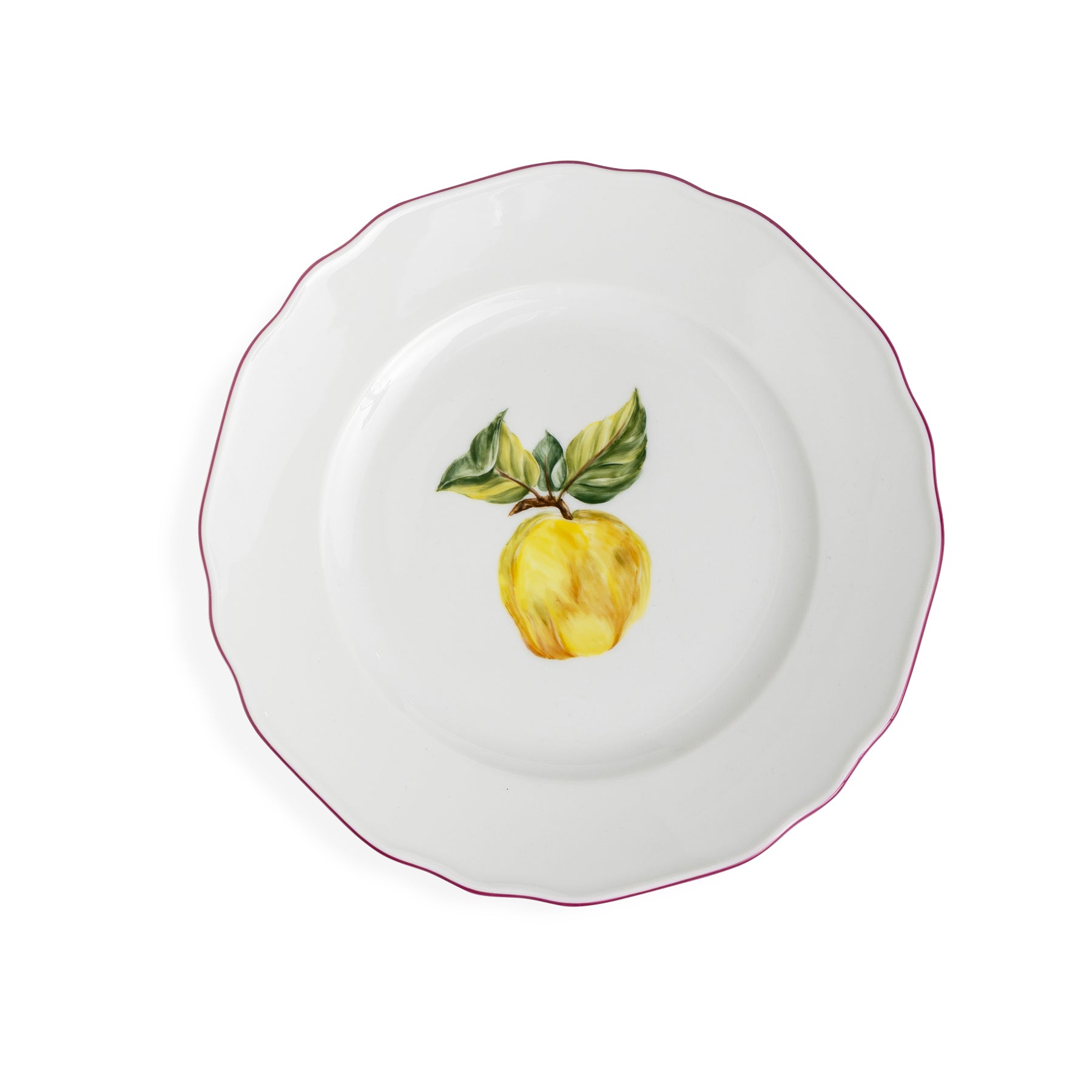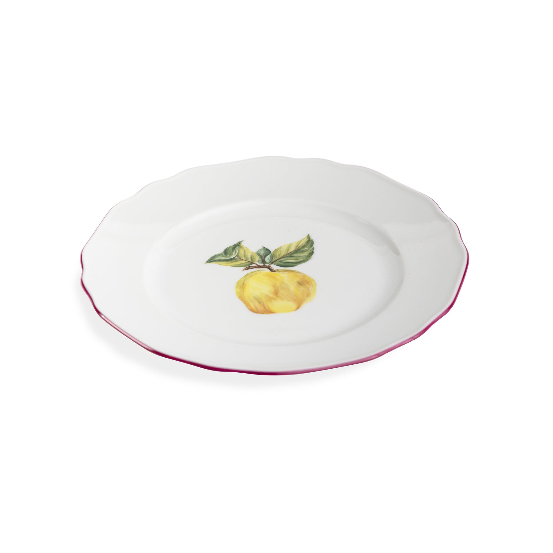 Augarten porcelain dessert plate with a hand-painted botanical image of a quince and a thin pink rim.