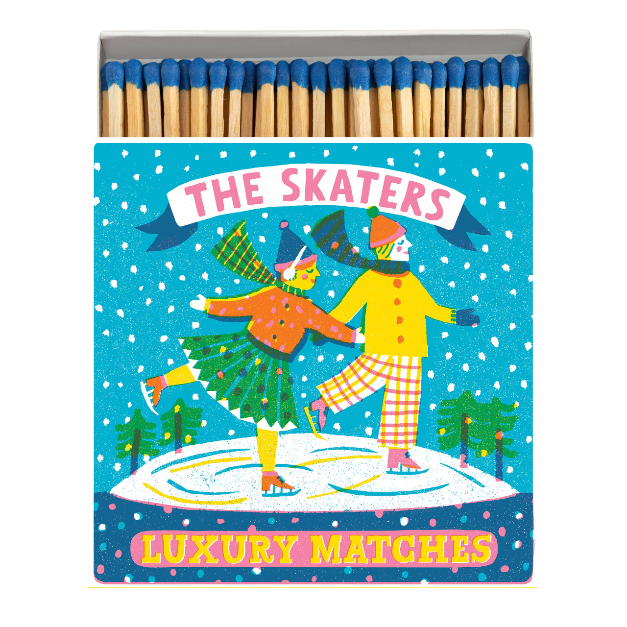 This signature square matchbox featuring two skaters gliding across an ice rink, wrapped in hats and scarves with the words 'The Skaters, Luxury Matches.'