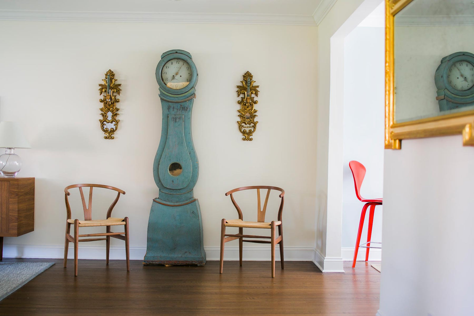 The 18th century antique tall case clocks – one Norwegian, the other Swedish – and formal 19th century Danish sconces added a stately touch. These were paired with original mid-century modern wishbone chairs by Hans Wegner. The combination of 18th, 19th and 20th century masterworks create a dialog of design that’s timeless and classic. But also very modern.