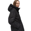 The coat has a metal zipper closure with a long ribbon puller and snap buttons under the front list, an elastic drawstring waist that can be tightened from the inside, and an inside chest pocket with a concealed zipper closure. List pockets with concealed snap button closures and ribbed cuffs at the sleeve ends.