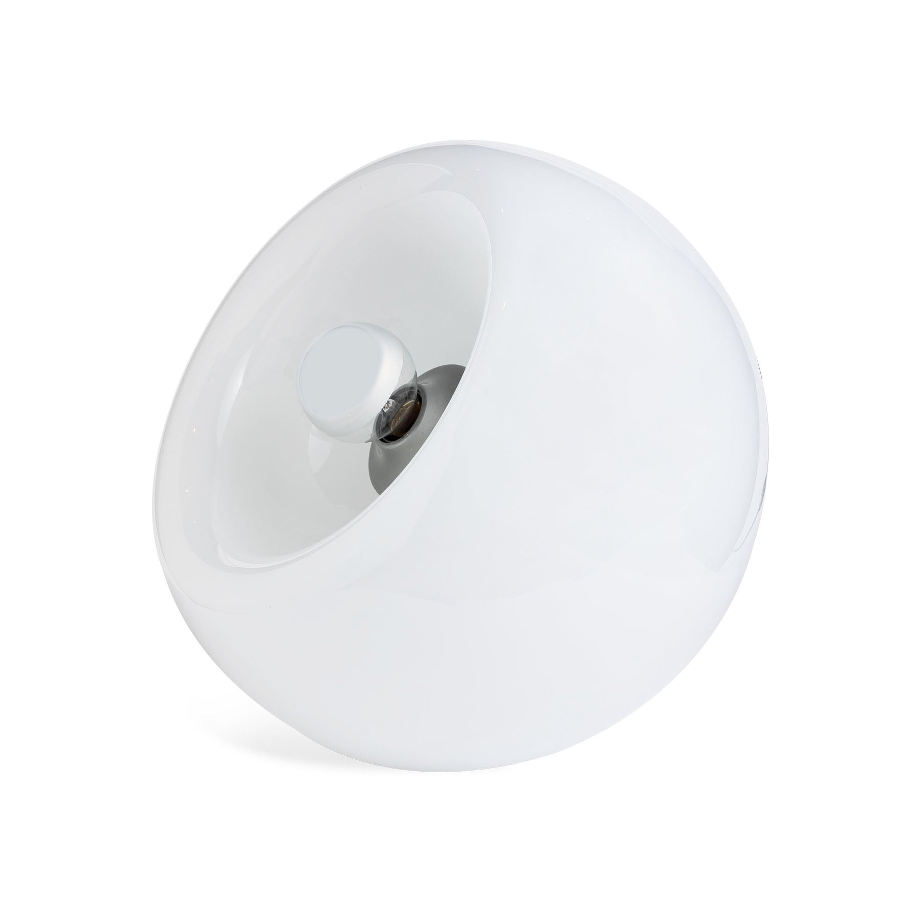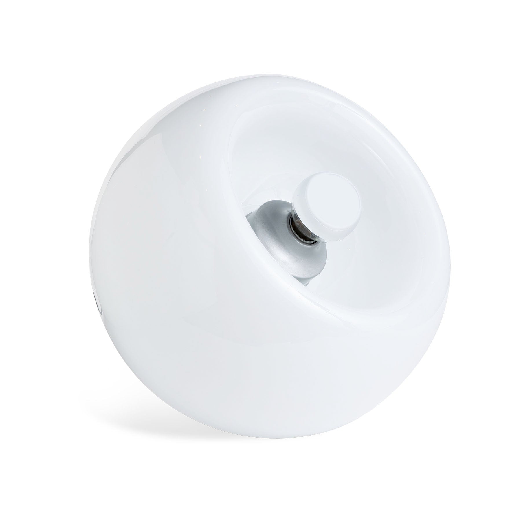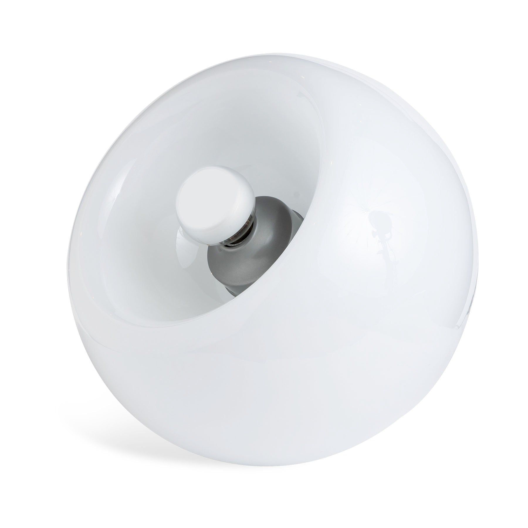 Blown white murano glass with double concave glass creates Space Age orbs with a lightbulb in the center. These beautiful orb lamps can be used on tables or set on the floor for dramatic effect.