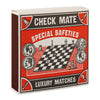 This signature square matchbox featuring the scene of a chess match with the words 'Check Mate, Special Safeties, Luxury Matches.'